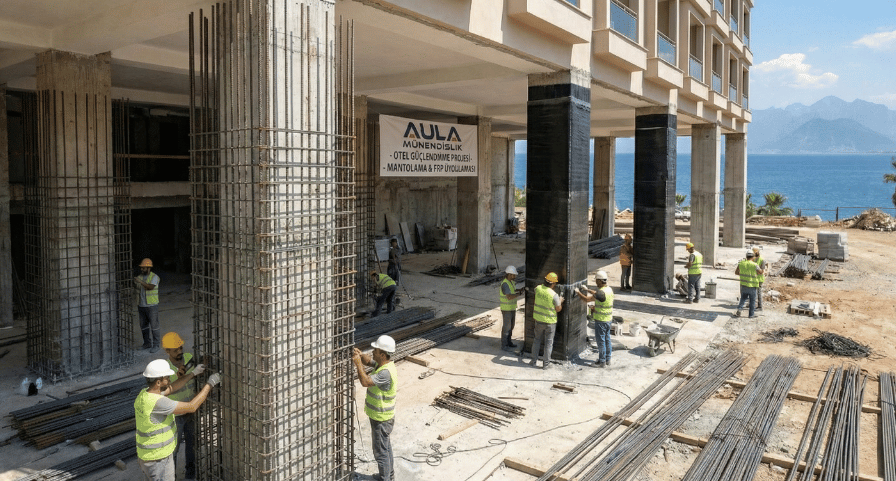 FRP (Karbon Elyaf) Sargı: Kolon ve kirişlerin karbon fiber kumaşlarla güçlendirilmesinde sertifikalı uygulama.